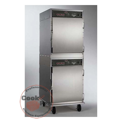 В данной конфигурации используется электромеханическое управление, что значит наличие на панелях управления термостатного контроля температуры, аналогового термометра, кнопки Вкл/Выкл и светового индикатора достижения заданной температуры. Для дополнительного увлажнения в камерах обоих отделений размещены резервуары для воды объемом 3,8 литра. Двойные вентиляторы и вентиляционные боковые отверстия позволяют горячему воздуху циркулировать в камерах хранения, что так же является важной составляющей для сохранения продуктов горячими и свежими до подачи. Исполнение сквозное. Корпус и дверцы выполнены из нержавеющей стали. Двери самозакрывающиеся, с магнитными защелками, остаются в открытом положении при угле открытия более 90 градусов. Полностью изолированные камеры и плотно закрывающиеся дверцы обеспечивают качественное хранение продуктов при потребление небольшого количества энергии. Температурный режим настраивается от 71°C до 99°C. Тепловой шкаф оснащен набором колесиков высотой 127 мм, на передних установлены блокираторы, что делает его весьма мобильным.