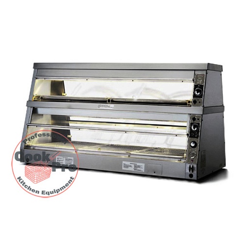 Витрина оснащена раздельным контролем за верхним и нижним нагревом обоих уровней и температурой воды. Есть кнопка включения экономичного режима работы. Исполнение данной модели сквозное. Дверцы отрываются наверх (система "Flip-Up"), расположены как со стороны сотрудников, так и со стороны покупателей. Прочная конструкция выполнена из нержавеющей стали. Покрытие прозрачных акриловых дверец препятствует появлению царапин. Для удобного ухода и обслуживания панели съемные. Вместимость нижнего уровня витрины составляет 3 подноса американского стандарта размером 457 х 660 мм, верхнего уровня - 2 подноса. Вместимость встроенного резервуара для воды - 38 литров. Подключение к 380V (3 фазы).