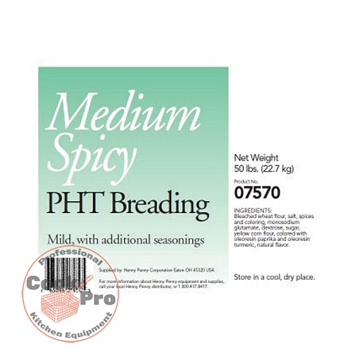 Henny Penny Medium Spicy PHT Breading 07570 - сбалансированная приправа, по мягкой текстуре похожая на панировочную смесь Henny Penny Regular PHT Breading, но с добавлением ряда специй, придающих ей пряный вкус и аромат. Перед готовкой рекомендуется выдержать запанированный продукт в течение 15-30 минут.